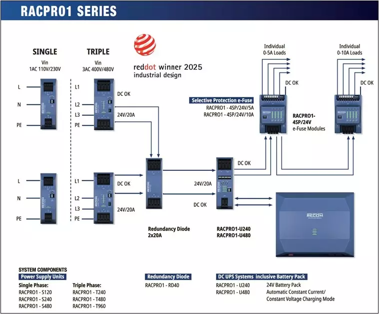 RACPRO 系列工业导轨式交流 / 直流(AC/DC)电源具有结构紧凑、效率高的特点,包含额定功率最高达 480W 的单相输入版本,以及额定功率最高达 960W 的三相输入版本。此外,REDIIN 系列专为成本敏感型应用设计,提供单相通用交流输入,额定输出功率最高达 480W,同时在高要求工业环境中仍能保持出色性能,不会因成本控制而妥协。全新 REFIN 系列采用超薄设计,以 “阶梯式” 结构呈现,持续额定功率最高达 90W。为完善产品体系,还提供额定电流最高达 10A 的四通道可复位电子断路器(e-Fuse,导轨式封装),以及即将发布的冗余二极管模块。