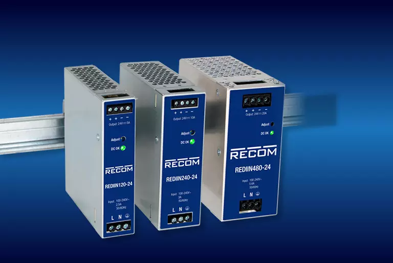 RECOM 推出的 REDIIN 系列导轨式 AC/DC 电源兼具高性价比,支持 90-264V 交流输入,分为 120W、240W、480W 三个额定功率版本,宽度分别为 30mm、40mm、56mm,结构紧凑。产品提供 24V、48V 直流单输出,其中 120W 型号还提供 12V 直流输出,所有型号的输出电压均可通过模块前面板调节。